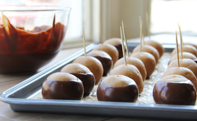 Pick up a buckeye with a toothpick and gently immerse the ball 3 quarters the way into the chocolate and roll around until you have what looks like a 'buckeye' (a bit of peanut butter showing at the top). Put back on the baking tray and take the toothpick out.