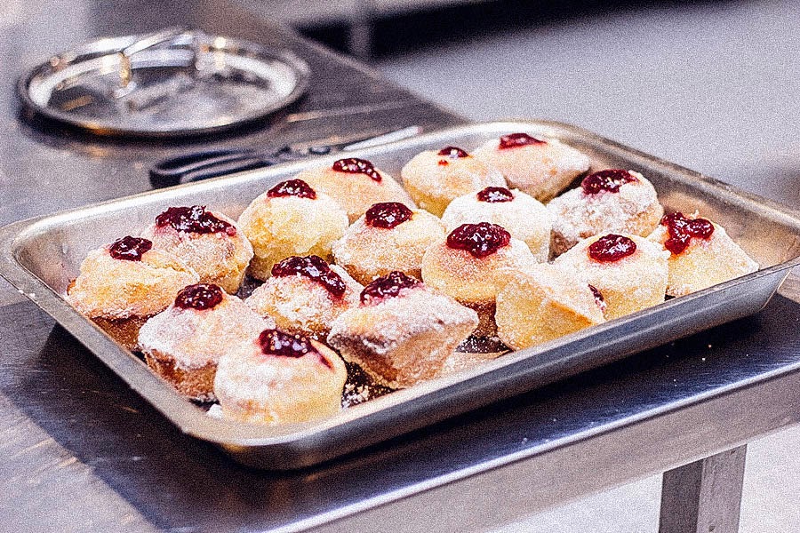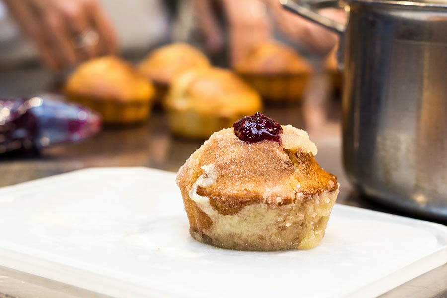 Fit a piping bag with a long & thin nozzle and spoon in the jam. Pierce the tops of the duffins with the piping bag and squeeze some of the jam into each duffin.