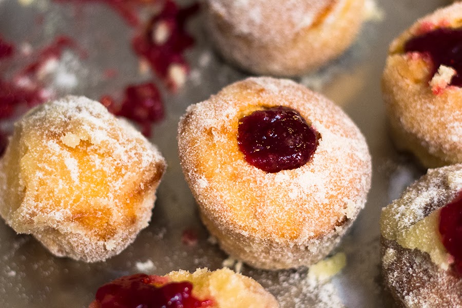 Pour the melted butter into one bowl, sugar in another. Dip each duffin into the butter and then toss in caster sugar.