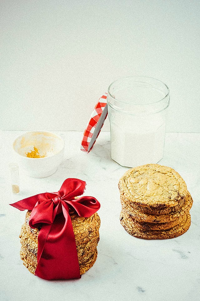 Wrap in cling film and chill for 2 hours, or overnight. Preheat oven to 180 C. Weight out 75 grams of dough and roll into a chode-like cylinder. Place cookies 3 inches apart on lined baking trays. Bake for 12 minutes. Leave to stand and cool. Brush with gold lustre dust, if desired. Eat within 3 days!
