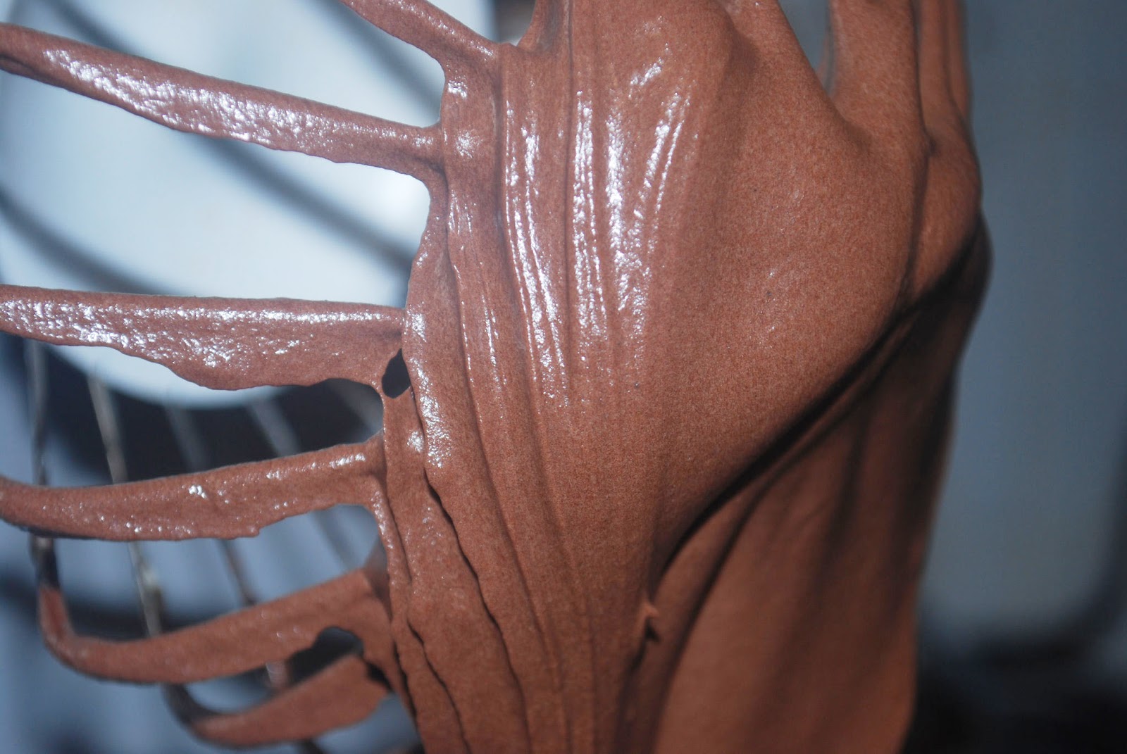 - Lastly pour in the chocolate mixture and beat sparingly till the mixture is consistently dark in colour.