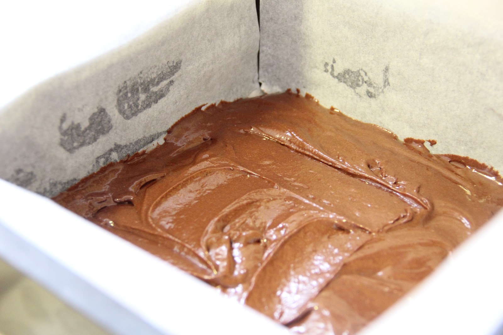 - Plop half of the brownie batter into the prepared tin and spread around well.