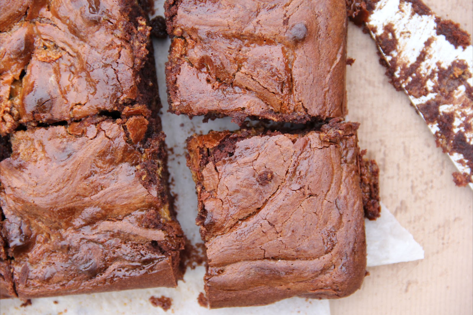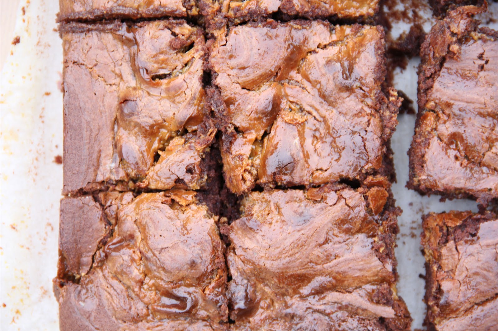 - Repeat the process again with the rest of the batter, so that you have swirls of caramel on top of the brownie ready for the oven.