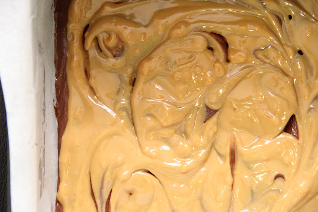 - Layer half of the caramel on top of the batter and spread around evenly. Then take a knife and use it to make swirls around the raw better.