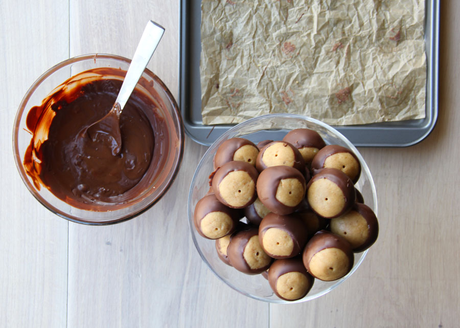 Pick up a buckeye with a toothpick and gently immerse the ball 3 quarters the way into the chocolate and roll around until you have what looks like a 'buckeye' (a bit of peanut butter showing at the top). Put back on the baking tray and take the toothpick out.