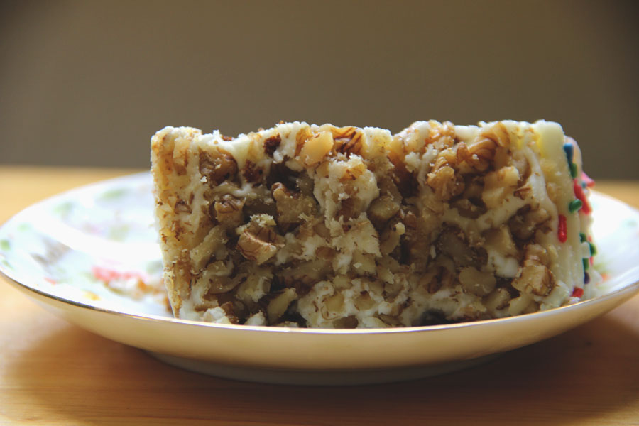 This cake is overly nutty, spicy and indulgently rich and the walnuts go a bit soft on the outside when baked in cake, as if they’re