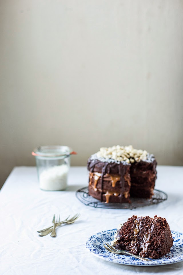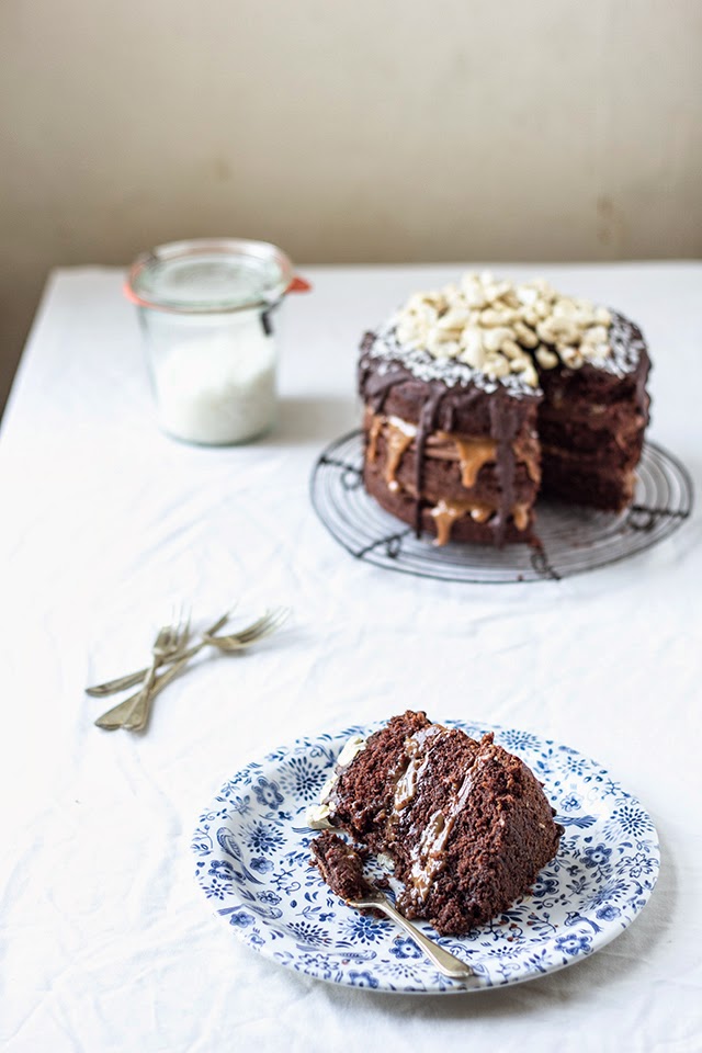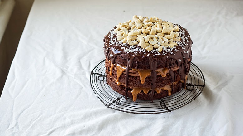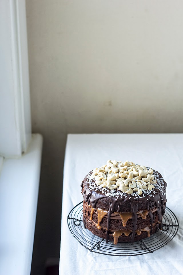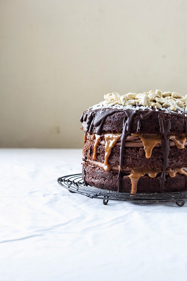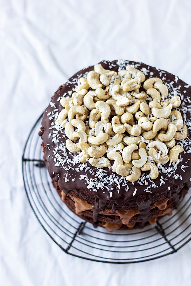 Assemble the cake. Split the cakes horizontally using a serrated knife and brush away the crumbs (there will be a lot!). Place the first layer on a cake plate and spread a quarter of the chocolate icing on top, then spread a quarter of the dulce de leche. Place the second layer on top and repeat - same with the third. Place the last cake on top and spread with the melted chocolate, letting it drip to the sides. Sprinkle with cashews and leftover coconut. Lasts for 3 days if kept covered.