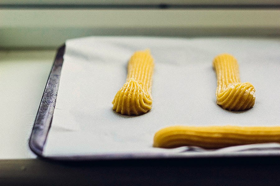 Make the choux. Bring the butter, salt and water to the boil on a medium heat. Once the butter has melted, gradually tip the flour in. Whisk vigorously until a ball forms. Switch to a wooden spoon and beat the dough until it no longer sticks to the sides of the pan and then cook through for one minute. Transfer to a freestanding mixture fitted with the paddle attachment (or grab an electric whisk) and beat another minute on medium speed. Add the eggs one at a time until you reach a glossy and pipe-able mixture. Spoon the mixture into a piping bag fitted with a large French or round nozzle. Pipe 10-12cm lines spaced two inches apart, pull the piping bag against the raw éclair, almost flicking the end back into it (re photo). Bake for 15 minutes or until they’re puffed up and golden. Open the oven door for the last four minutes to let out the steam. Let cool completely.